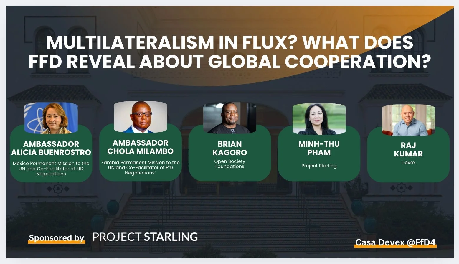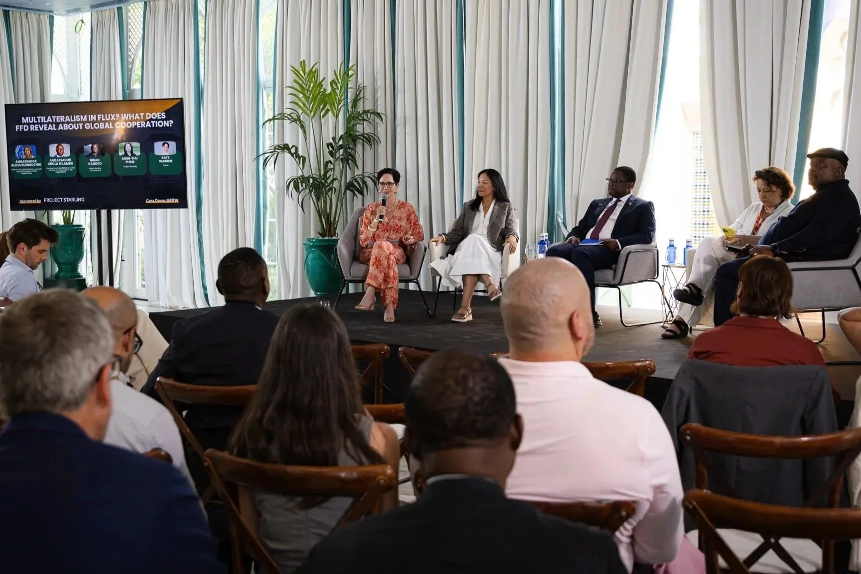 On June 30, the Starling Institute co-hosted a panel discussion with Devex on the sidelines of the FfD4 Conference in Sevilla, Spain. Reacting to the FfD4 Outcome document on the panel was: H.E. Dr. Chola Milambo, Permanent Representative of Zambia to the United Nations; H.E. Ms. Alicia Buenostro, Deputy Permanent Representative of Mexico to the United Nations; Brian Kagoro, Managing Director of Programs at the Open Society Foundations; and Minh-Thu Pham, Starling Institute CEO and co-founder. The event was moderated by Kate Warren, Executive Vice President and Executive Editor at Devex.