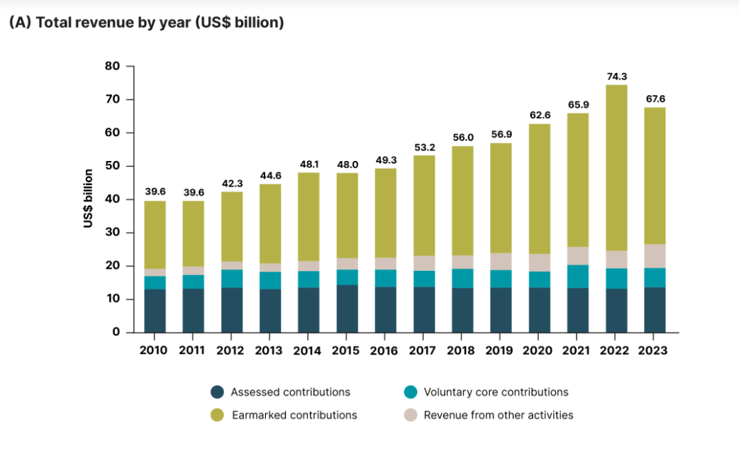 Let’s look at 2024 numbers. The United Nations received a total of around $53 billion dollars in assessed, voluntary and other contributions from its Member States. [5]